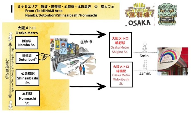 From/To Osaka SOUTH AREA around Shinsaibashi to Namba Station